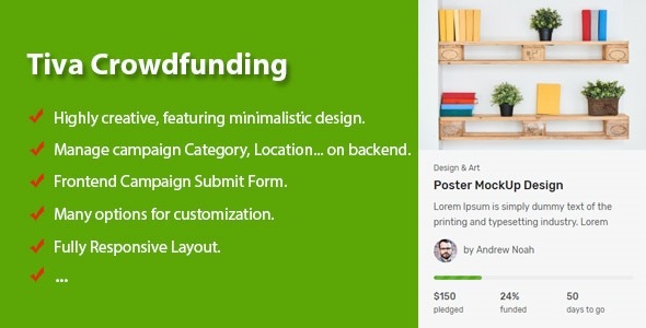 Tiva Crowdfunding is a complete and powerful wordpress plugin for crowdfunding and fundraising. It is a complete solution to start a Kickstarter-like website and help other succeed with incredible projects.